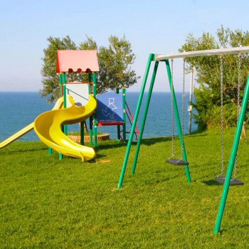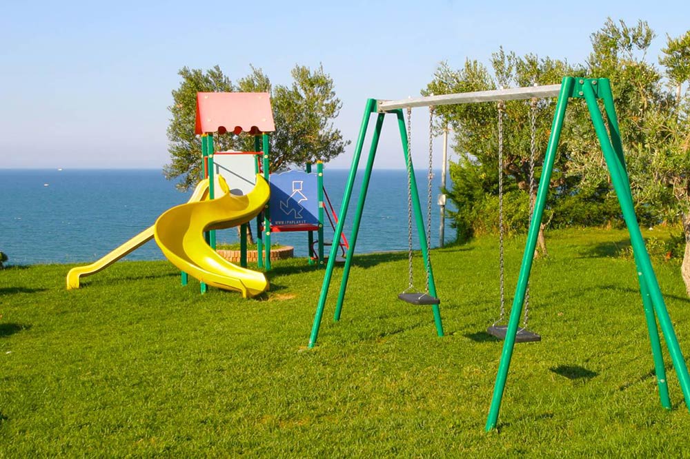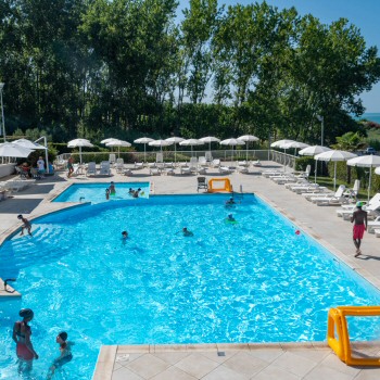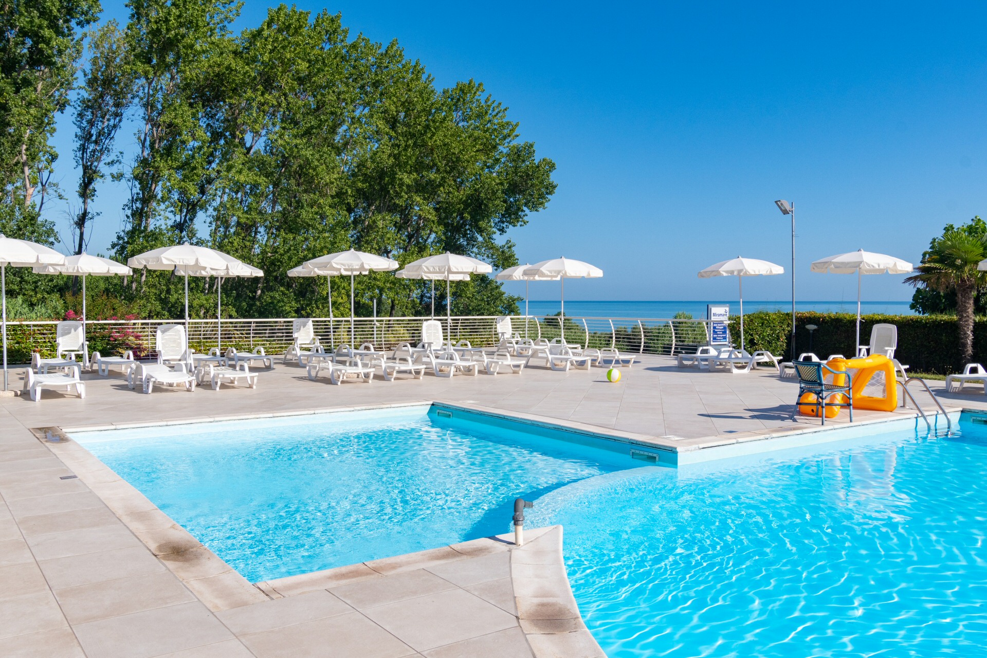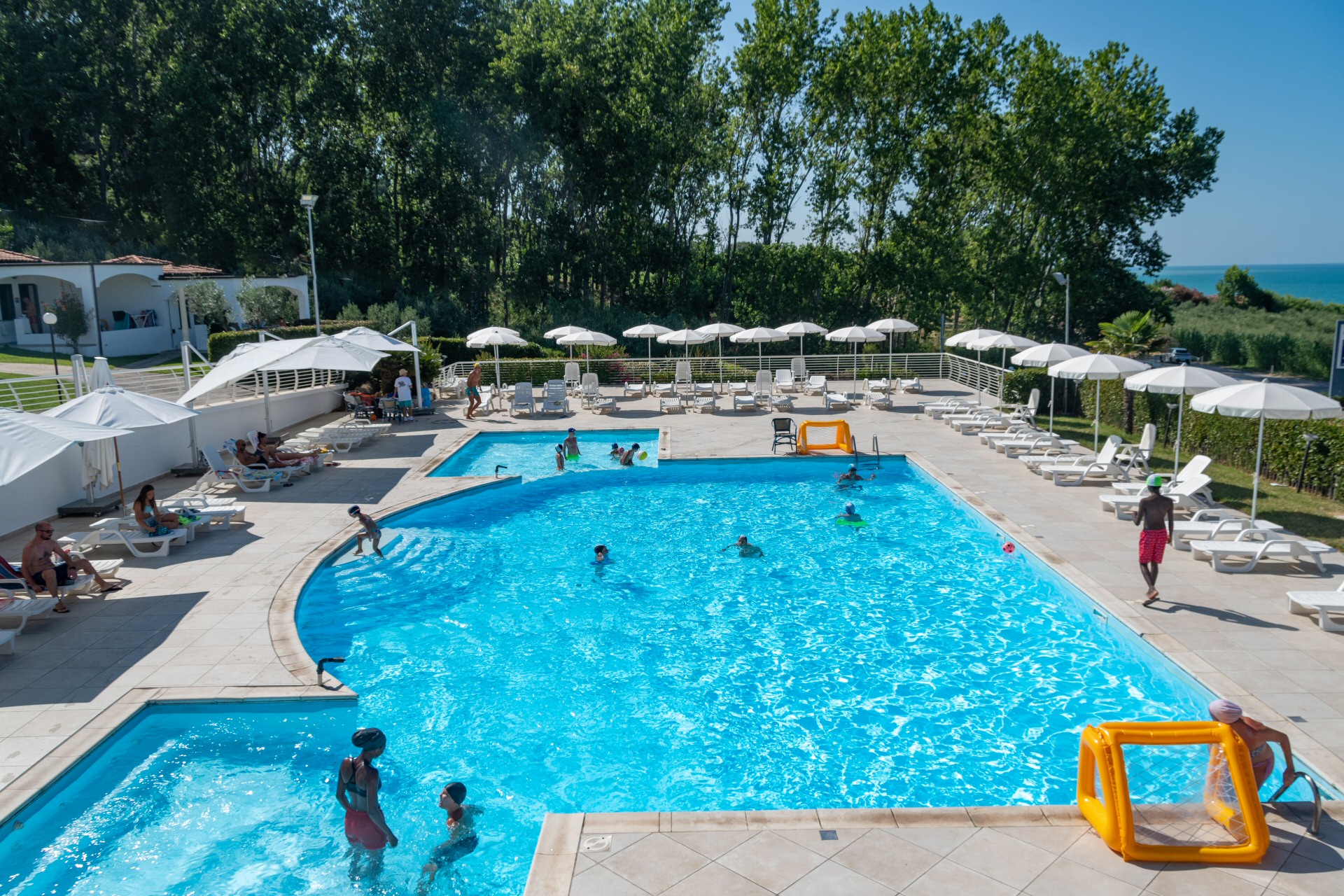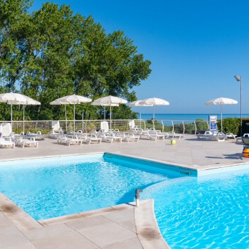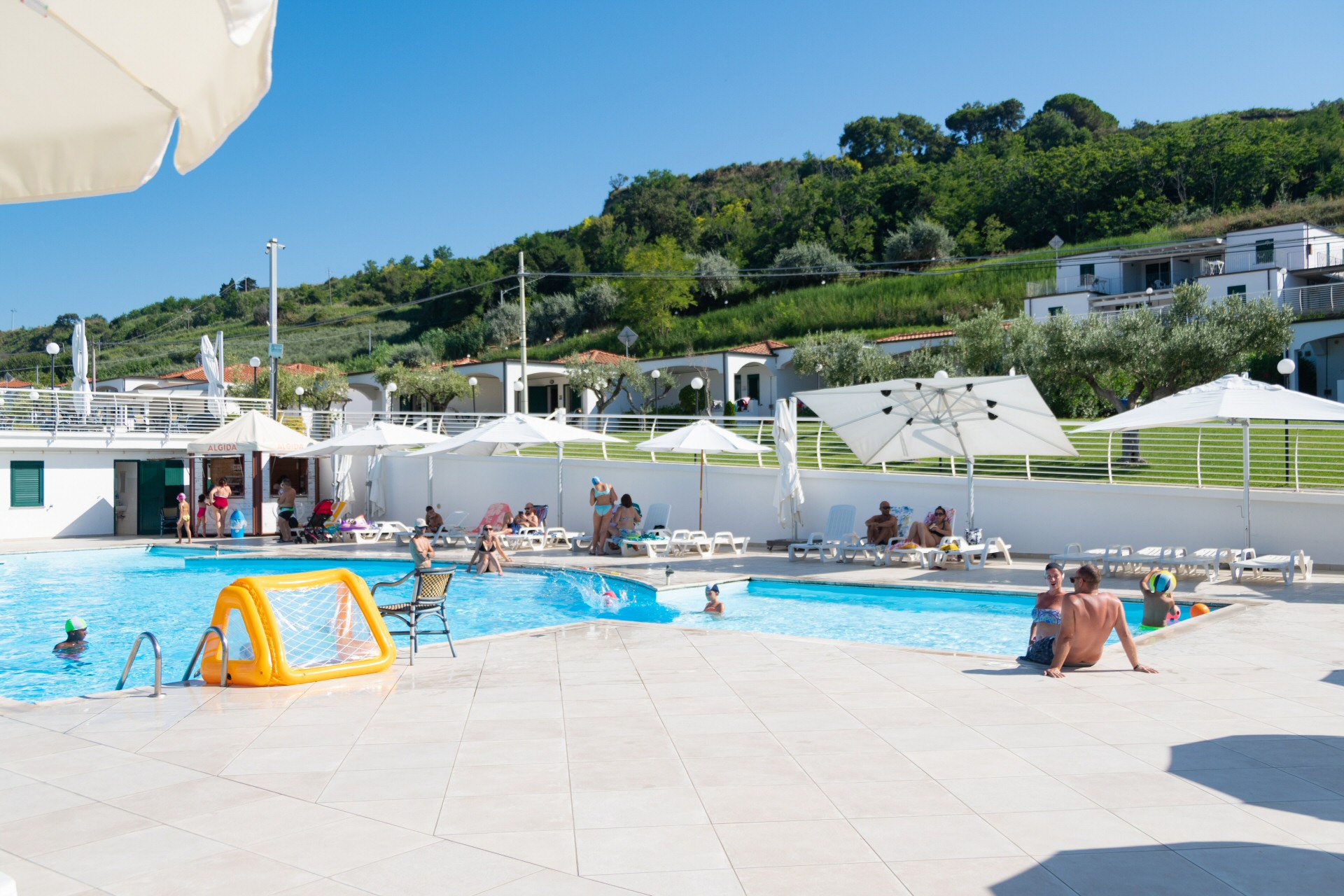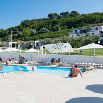 La piscina del villaggio è grande e spaziosa e immersa nel verde. Gli alberi le fanno da cornice e sullo sfondo si può ammirare la distesa di mare blu. Chi vuole può godersi questo scenario indimenticabile nella nostra vasca idromassaggio.