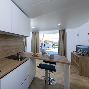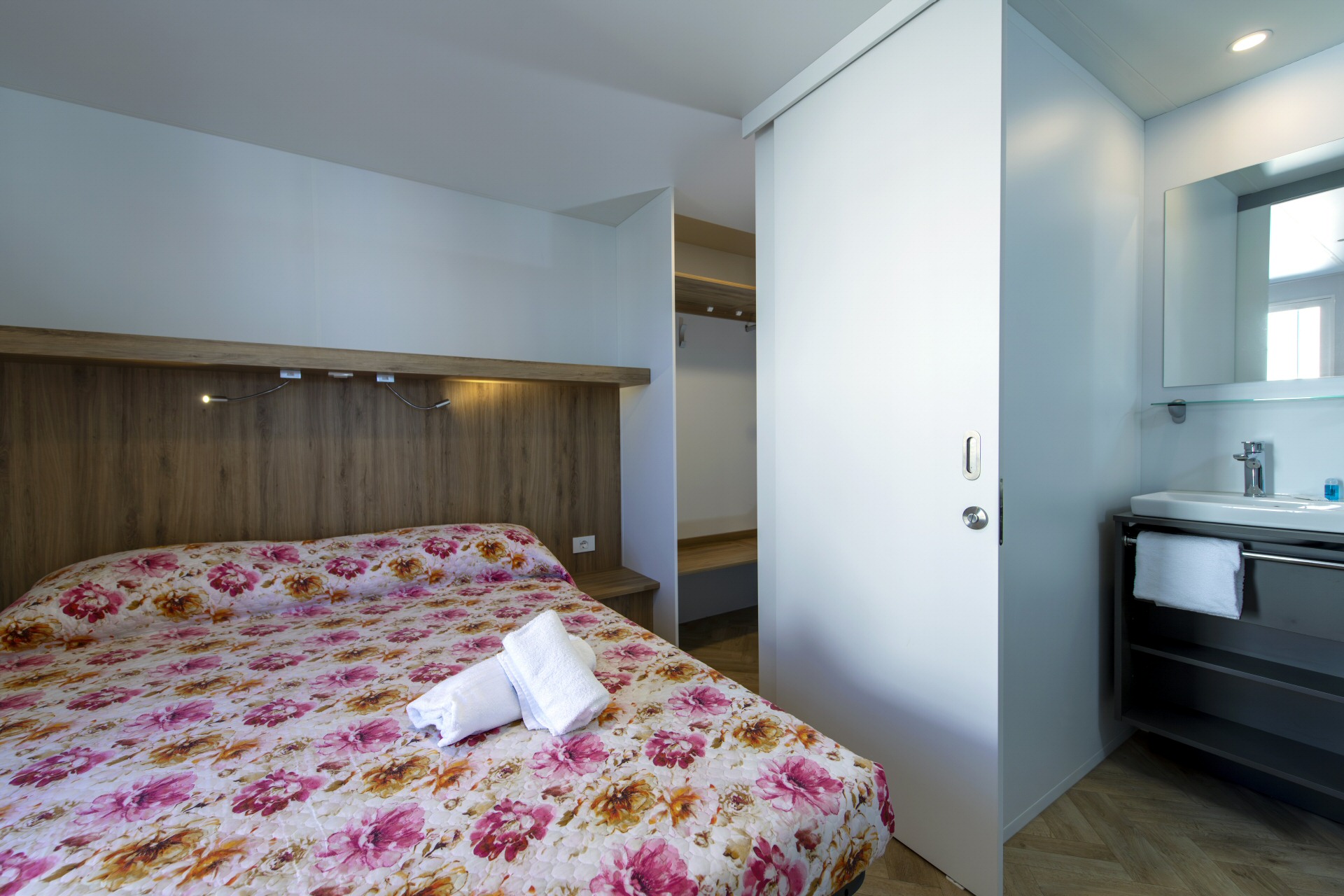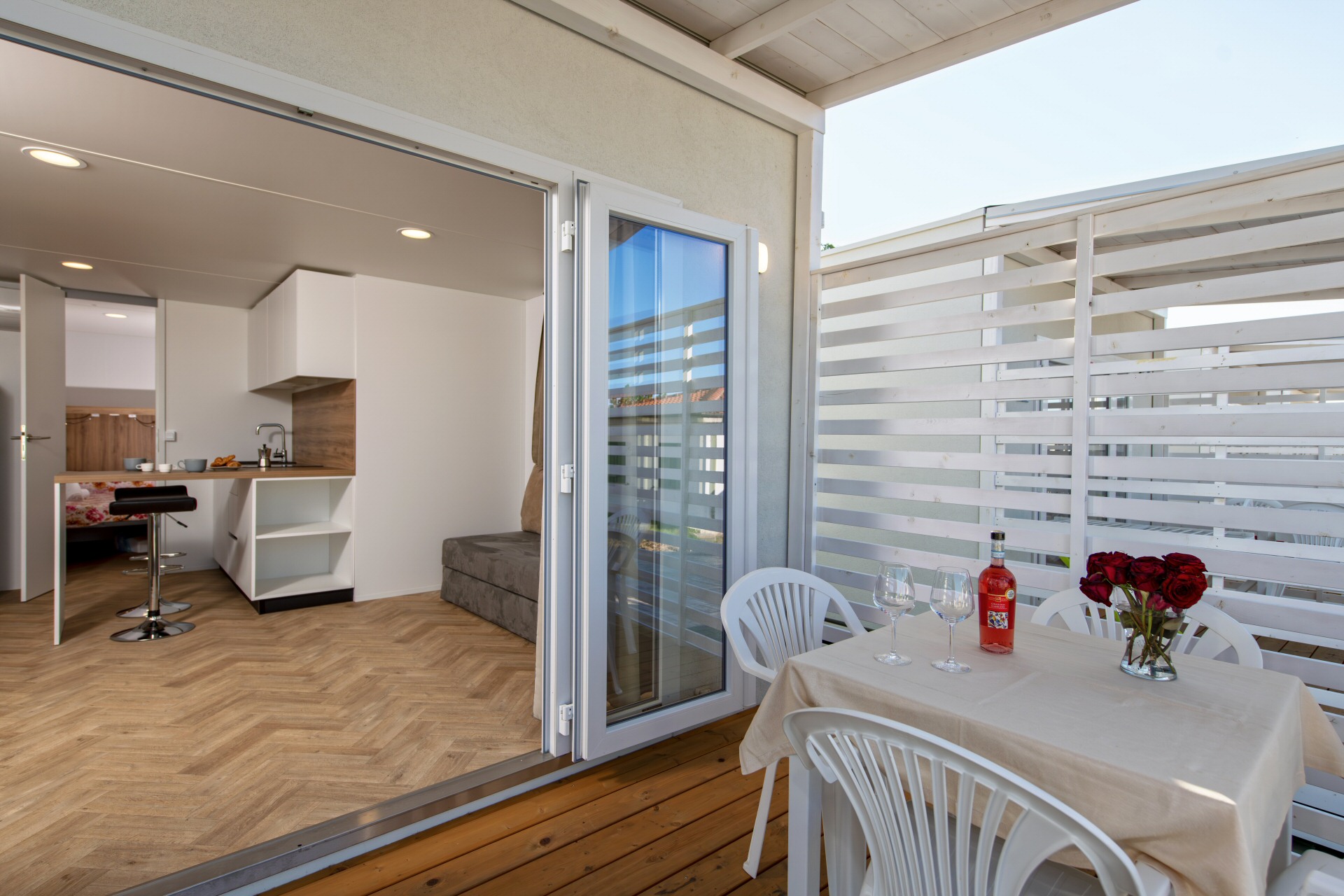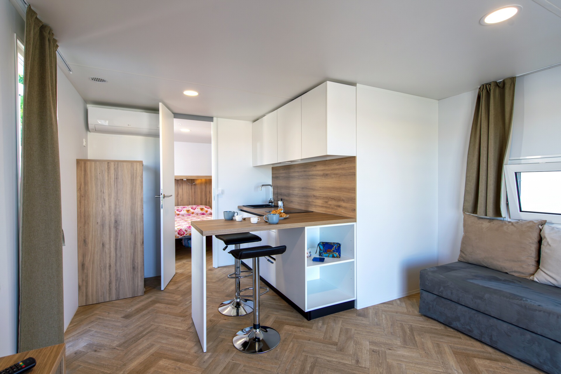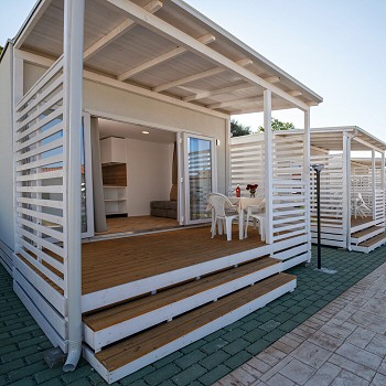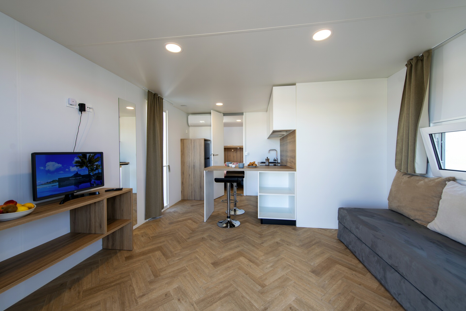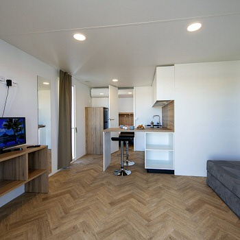 Casa mobile di circa 35mq con grande soggiorno con divano letto matrimoniale ed angolo cottura, camera matrimoniale con cabina armadio, bagno grande,