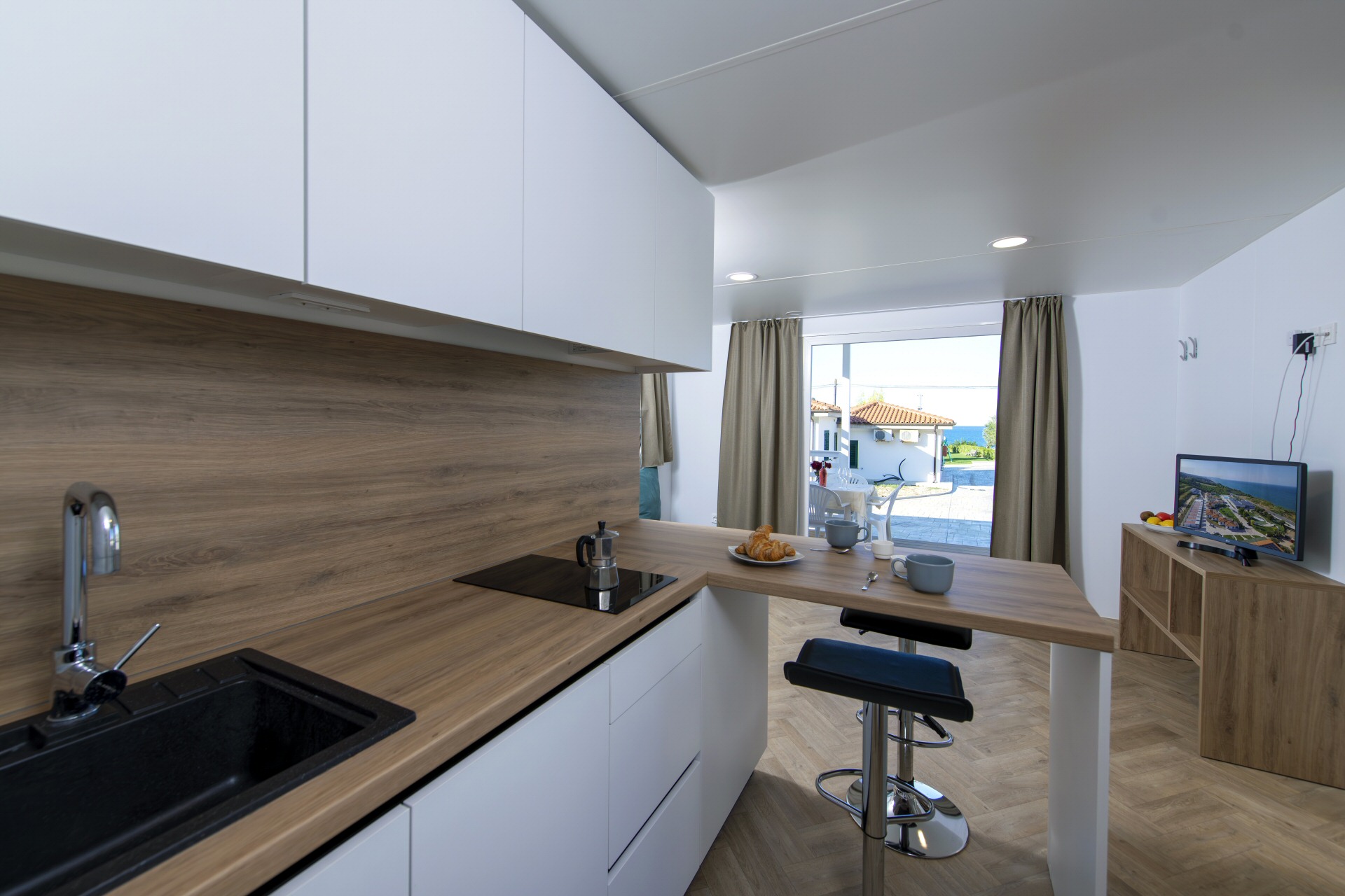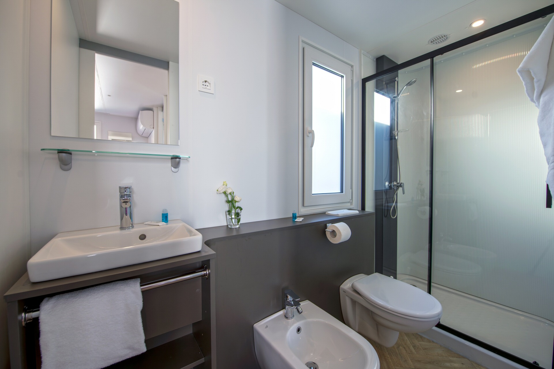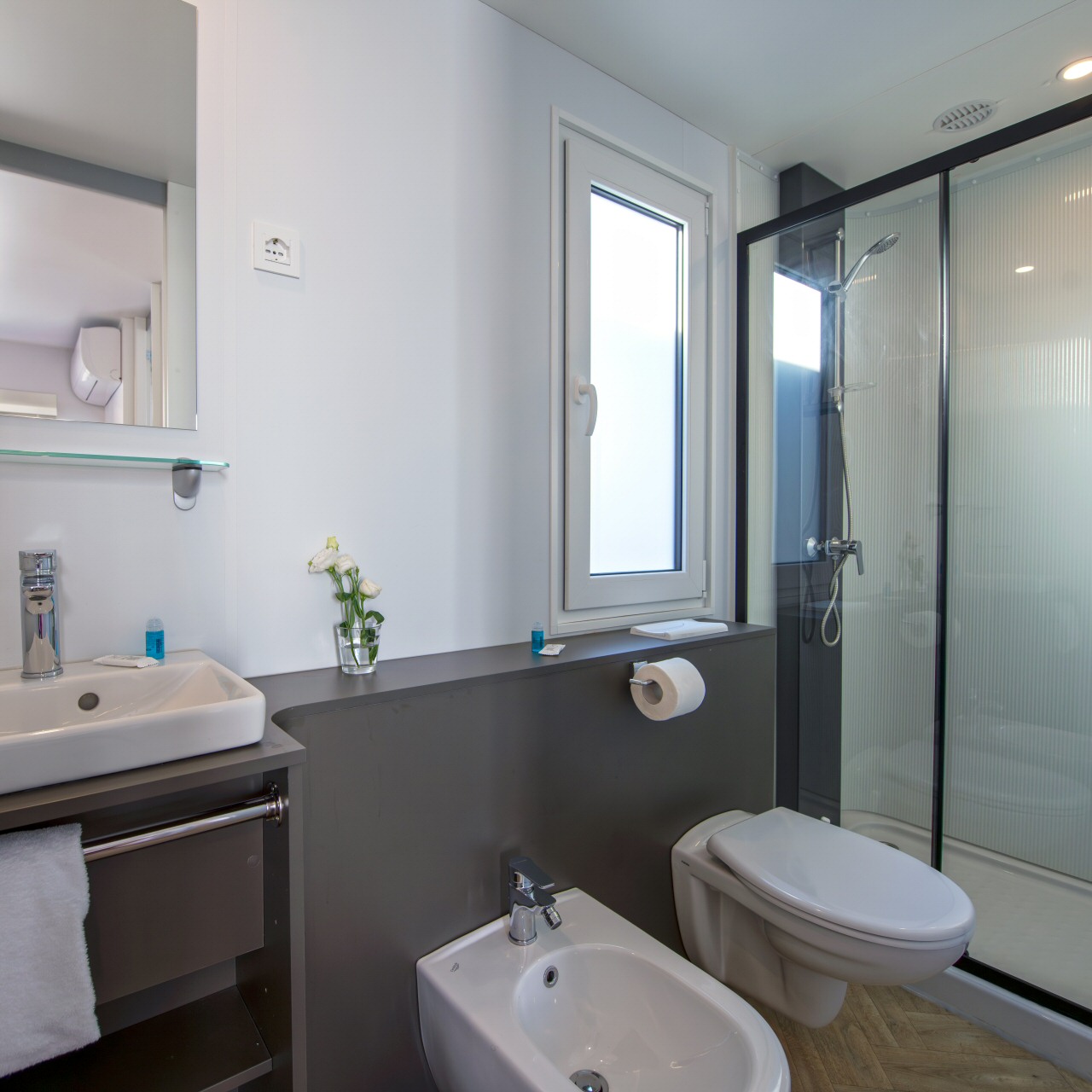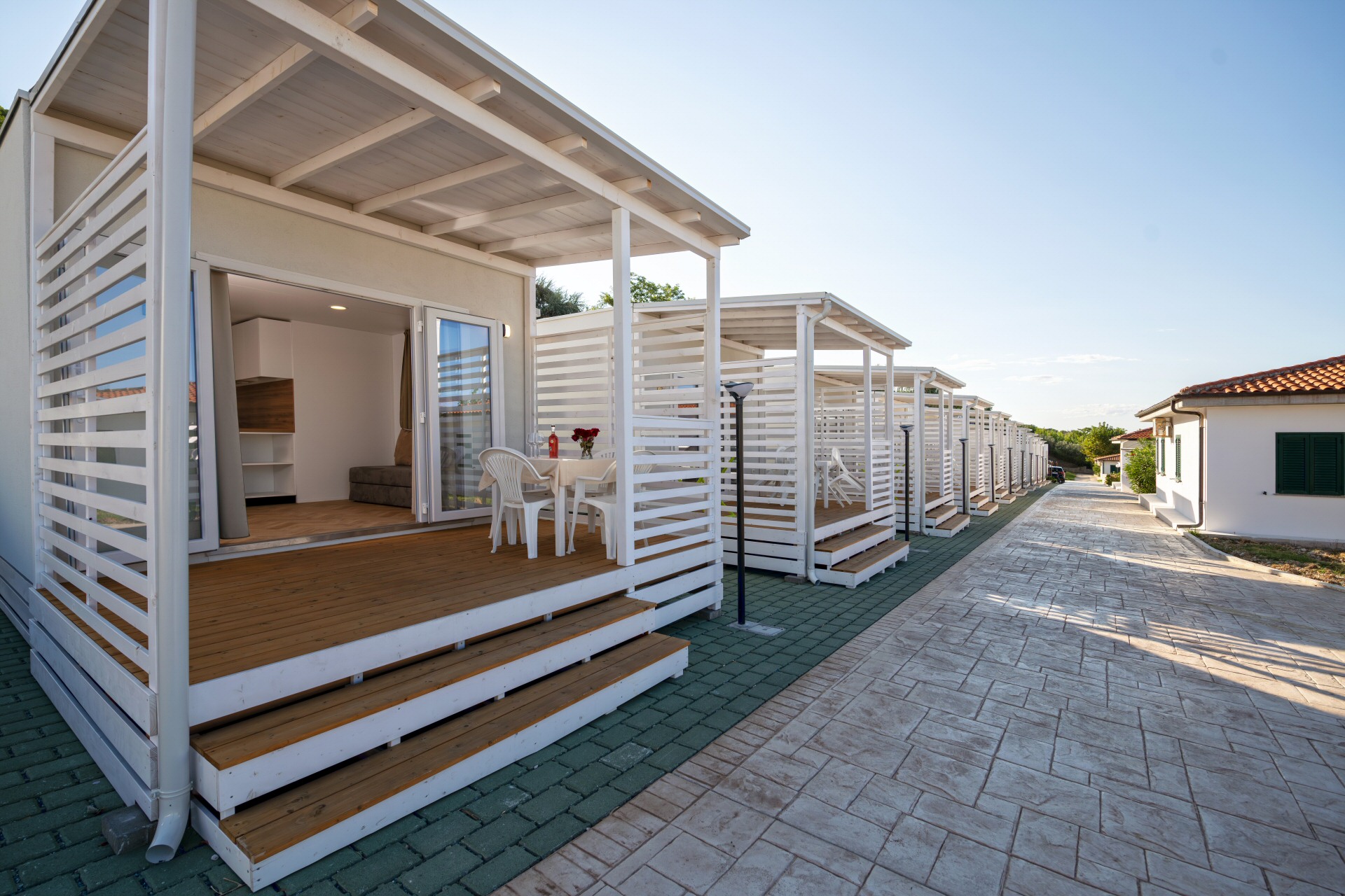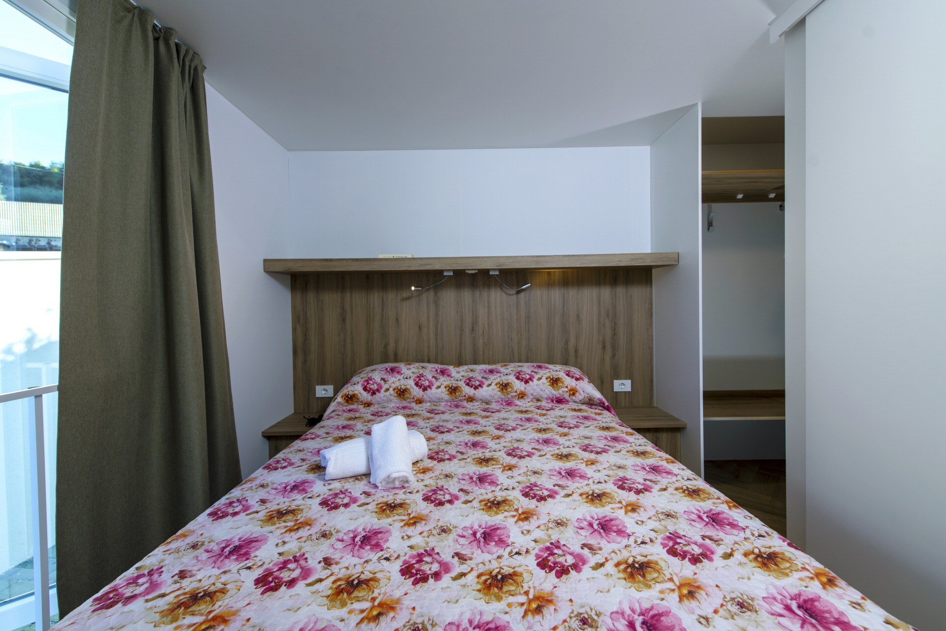 Casa mobile di circa 35mq con grande soggiorno con divano letto matrimoniale ed angolo cottura, camera matrimoniale con cabina armadio, bagno grande,